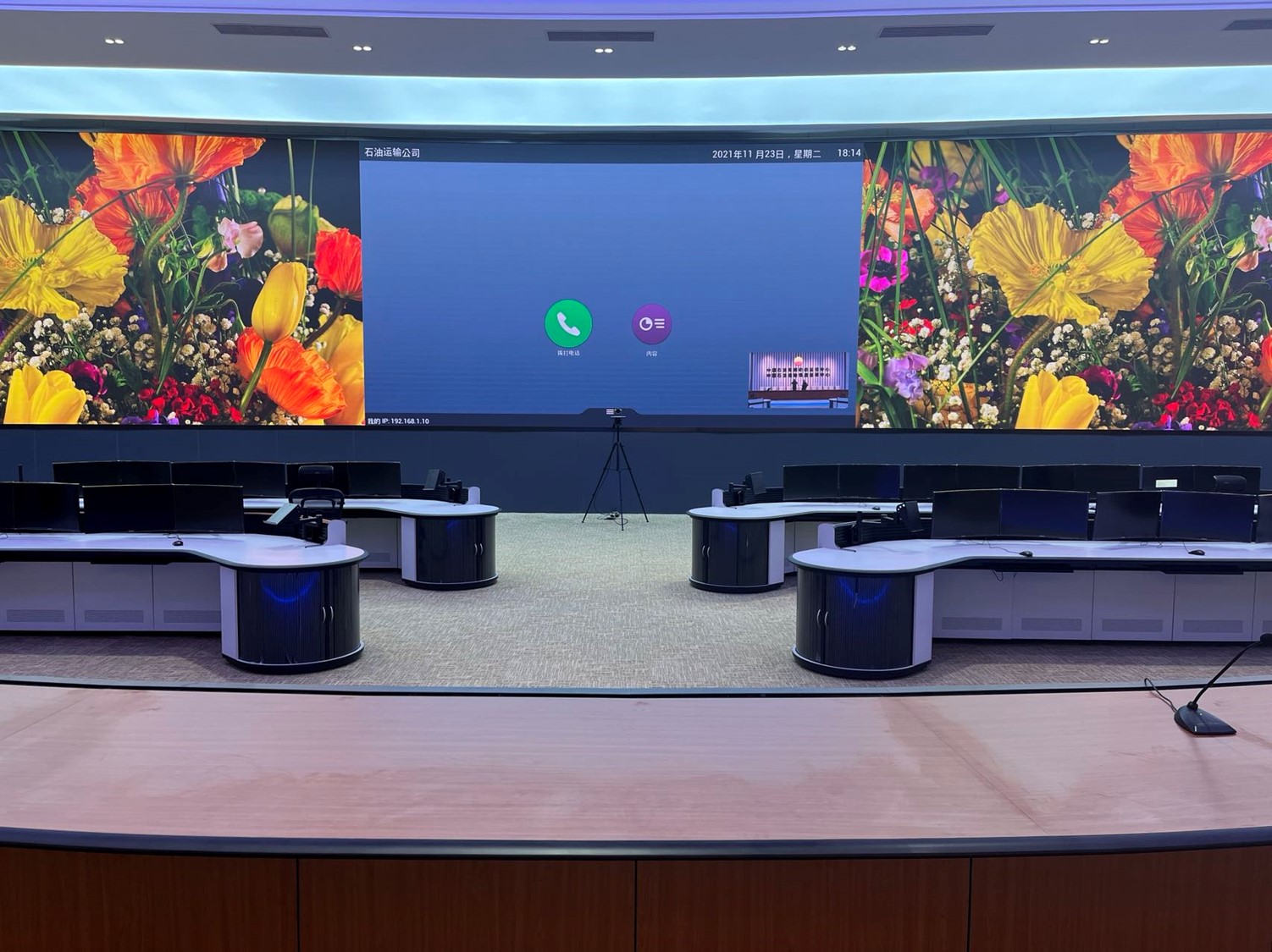 中國石油運輸公司調度中心項目位于北京順義和新疆烏魯木齊兩地,兩地調度中心各建1套1.56mm的LED監(jiān)控大屏,并重點對兩地視頻會議功能進行升級,由原來模擬視頻會議終端升級為高清終端,實現雙路高清攝像機信號的實時切換及雙流顯示。保證兩地調度中心會場互聯互通,實現視頻交流,通過集團M